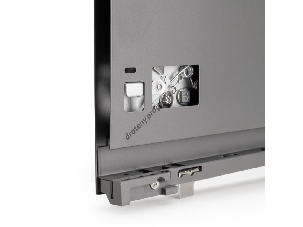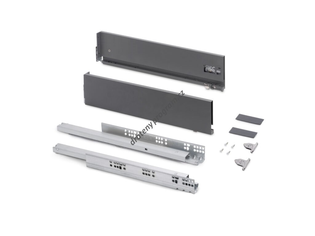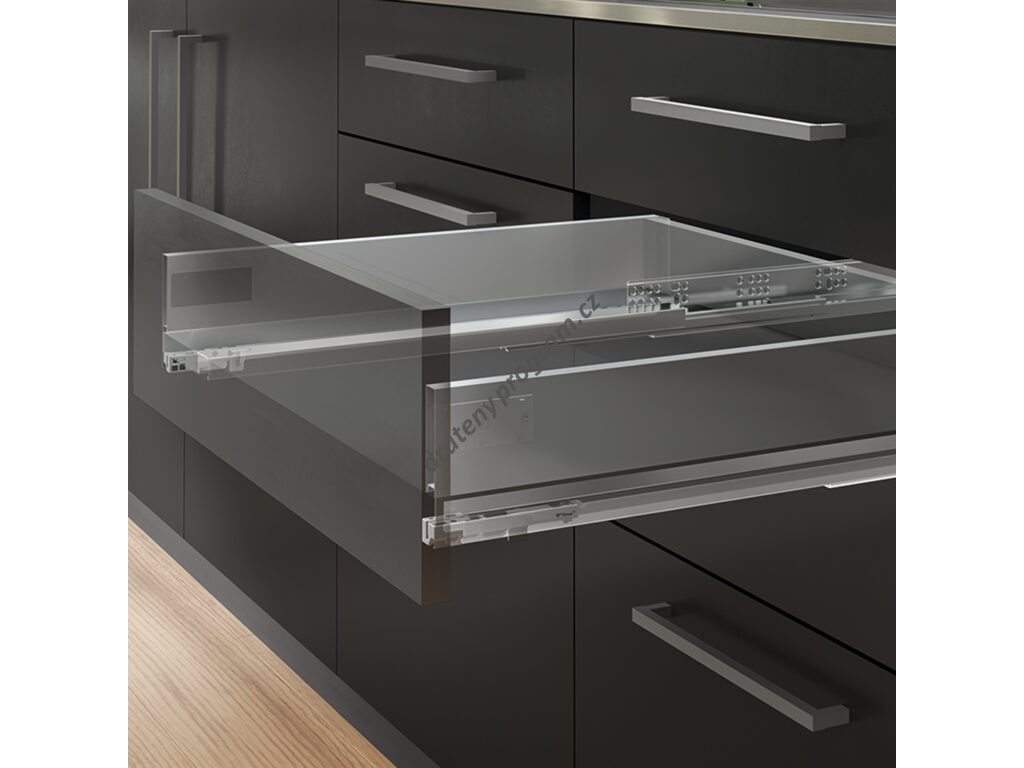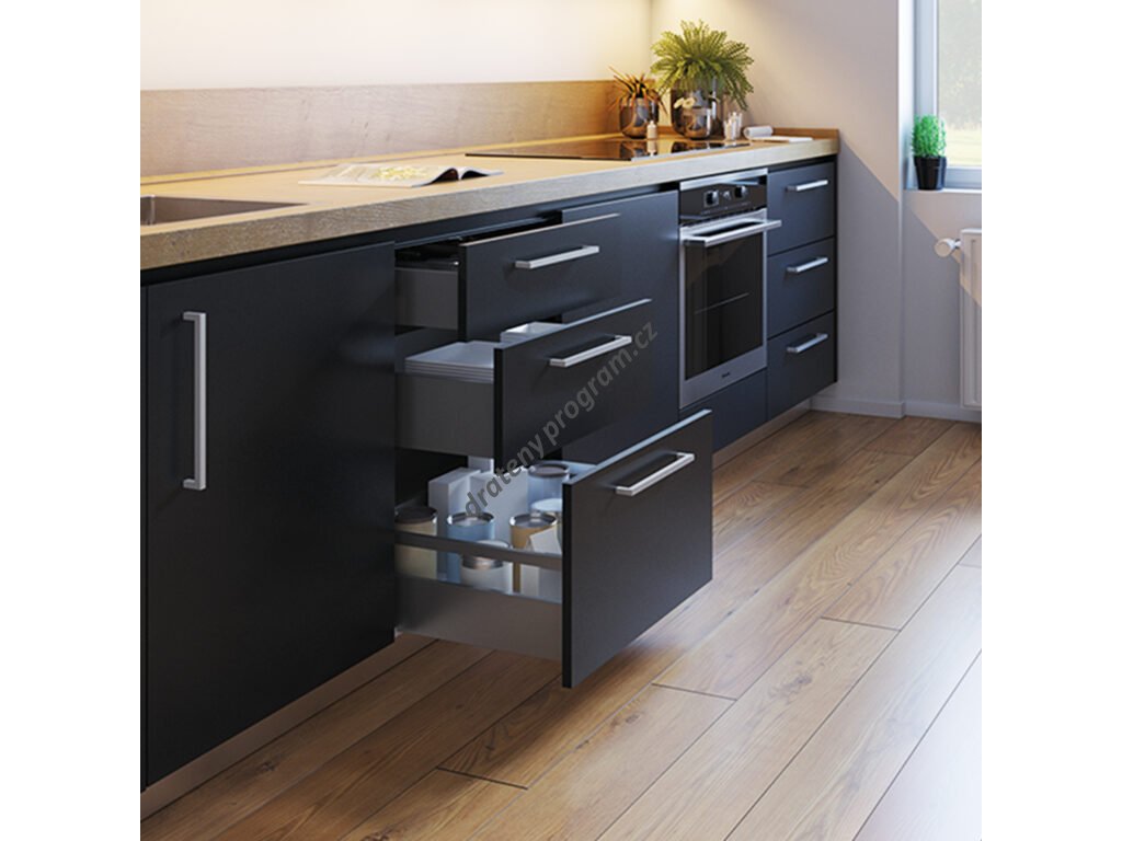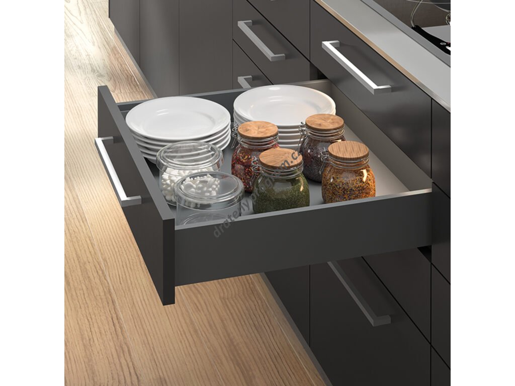 Kovové bočnice jsou vyrobeny z oceli s povrchovou úpravou antracit nebo bílá. 3D regulace umožňuje nastavení čela zásuvky ± 2 mm vertikálně, ± 1 mm horizontálně a sklon -1,5/+4 mm. Pojezdy jsou plně výsuvné s tlumeným dovřením a umožňují maximální zatížení zásuvky až 40 kg.