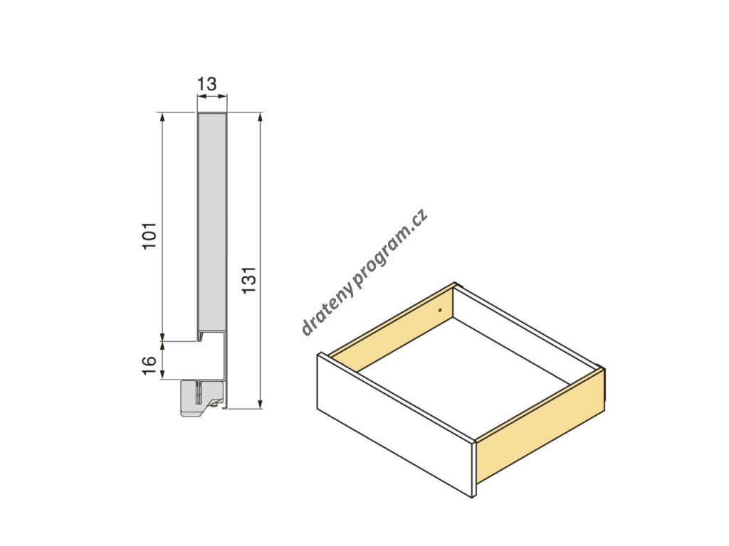 Dimenzováno na tloušťku lamina 16 mm pro dno a zadní stranu zásuvky.